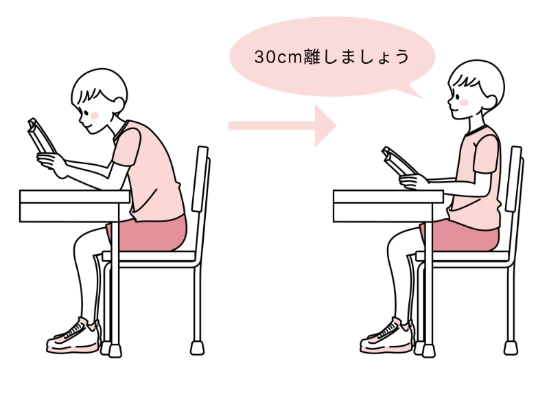読書や勉強、ゲームなどの近業作業を行う際は、目と対象物の距離を30cm以上離し、30分に1回は遠くを見るようにして、連続して長時間続けないようにしましょう。